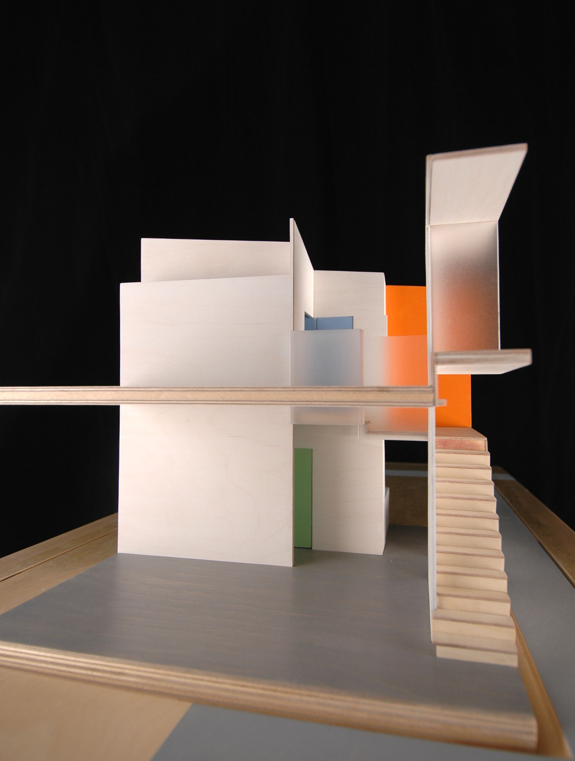 The simple exterior envelope contains spaces of varied proportions spiraling around a stair core, producing an inherently flexible, energy-efficient house. Openings in the stair core frame vertical and diagonal views between different levels. These give a sense of spaciousness, allows penetration of sunlight, and multiply opportunities for social contact within the family. One opening, a “light chimney” created by the stair, becomes the symbolic center of the house — the new hearth. The functional chimney and furnace of a typical house have been banished, replaced by fresh air outlets. Passive solar strategies and an energy recovery ventilator manage the heating and cooling. Interior spaces throughout the house are shaped for different potentials: walls become coves for indirect lighting, and nooks and ledges can be used for storage, daybeds, or seating. The cubic exterior is always oriented towards the sun, while the spiraling interior is oriented towards front/year yards. The house is made of thick and thin elements that work together to optimize exchanges and form a resilient structure. The changing relationship between cube and spiral creates a range of spatial and programmatic types. A minimum of resources produces maximum opportunities. The project was designed in collaboration with Studio THEM and Derek Porter Studio.