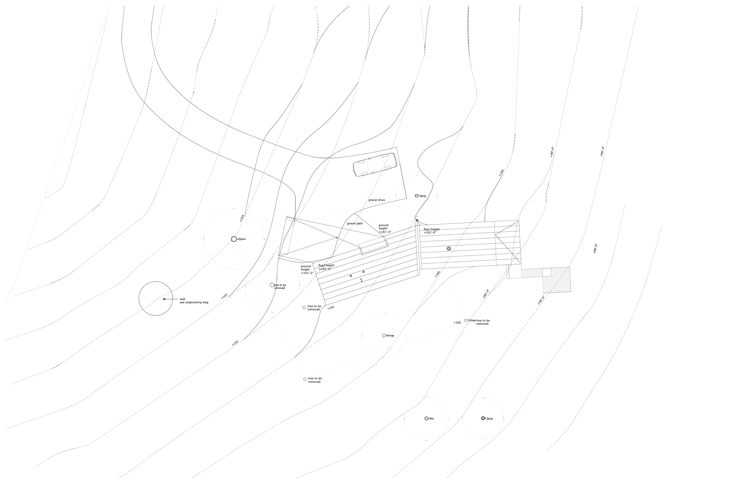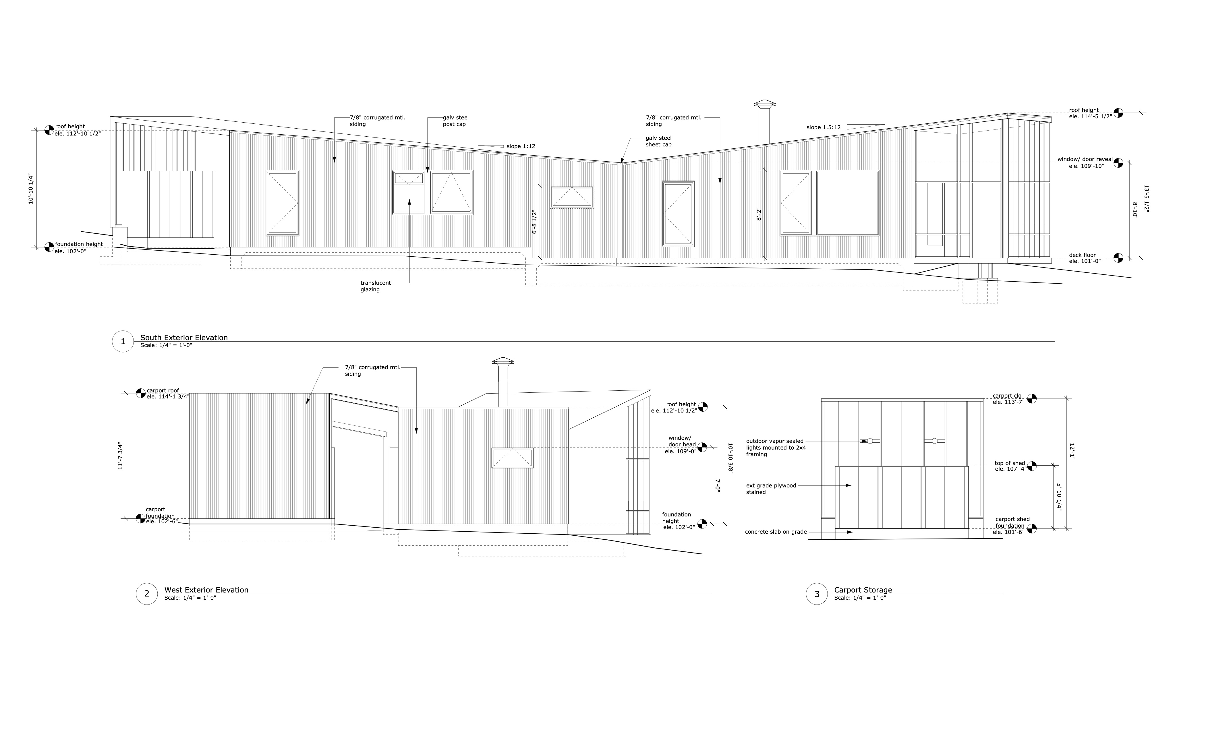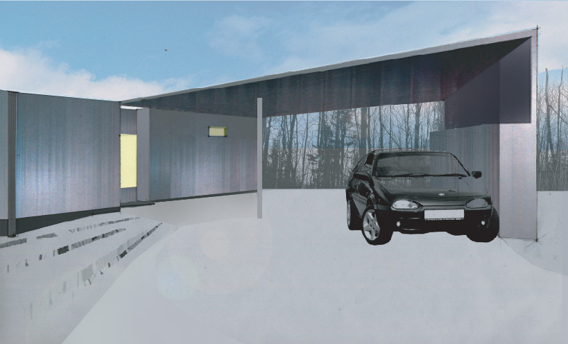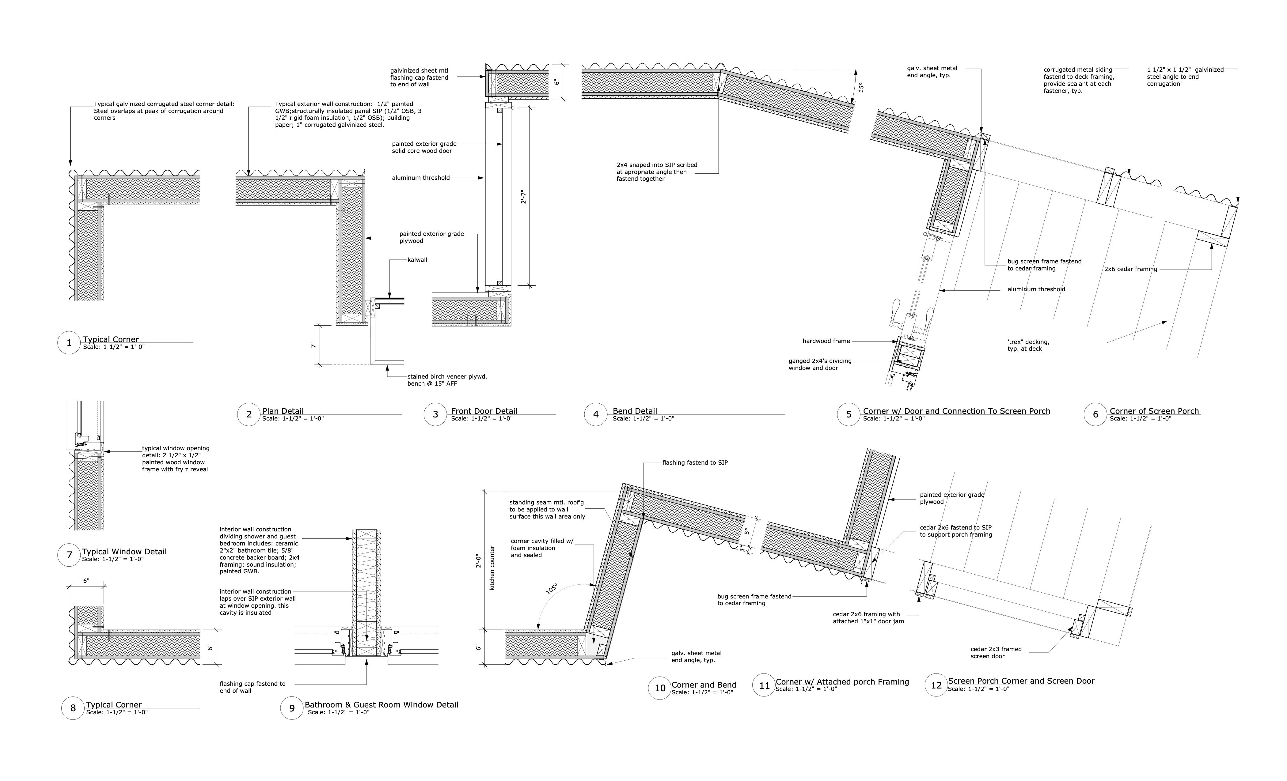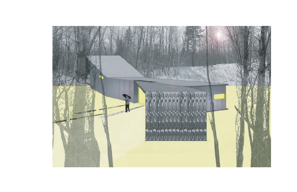 A 1,200 square foot vacation house fits into a natural break in the topography to become a threshold between the public and private sides of the property. The north side of the house is closed, except for a well-concealed entrance, while the south opens to views of the meadow and deck. The metal siding matches the ashen color of tree trunks and the stone-walls that surround the property. The house hides in the woods and fits into the earth. However, accentuated surfaces and highlights are intended to catch the eye. Passive solar strategies, panelized construction, a super-insulated envelope, and radiant heating all make the house energy-efficient.